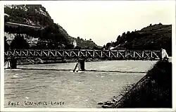 Die erste Brücke, die an der Stelle des heutigen Pont de Lavey über die Rhone führte, war eine Holzbrücke. Sie wurde 1917 von der Sappeurkompanie der Festung Saint-Maurice unter Hauptmann Paulus Chevalley errichtet und ermöglichte eine direkte Verbindung zwischen Saint-Maurice und Lavey. Zuvor führte der direkteste Weg von Lavey zum Bahnhof Saint-Maurice über die Rhonebrücke beim Schloss Saint-Maurice und war fast doppelt so lang. Der erste Pont de Lavey bestand aus einem durchlaufenden dreifeldrigen Howe-Gitterträger mit hölzernen Druckgliedern in den Diagonalen und den Gegendiagonalen, sowie vertikalen eisernen Zugstangen aus Rundstahl. Das verwendete Holz aus Lärchen, die im Wallis gewachsen waren, war nicht genügend trocken und die Brücke war vor der Witterung nicht geschützt, sodass sie sehr schnell in einem schlechten Zustand war. Anfang 1939 war sie so baufällig, dass das Waadtländer und das Walliser Baudepartement beschlossen, sie zu ersetzen.[1]
