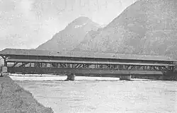 Für den Ersatz der Brücke wurden drei Projekte untersucht: eine Stahlbrücke, eine Betonbrücke und eine gedeckte Holzbrücke. Im Frühjahr 1939 war der Stahlpreis aber bereits so hoch, dass diese Lösung nicht mehr in Frage kam. Die Variante in Stahlbeton hätte sehr grosse teure Fundamente benötigt, weshalb die gedeckte Holzbrücke gebaut wurde, die 1941 fertiggestellt war. Die Brücke bestand aus einer einspurigen 3,05 m breiten Fahrbahn und zwei 1,25 m breiten Gehwegen, die ausserhalb des Hauptträgers von Kragarmen getragen wurden. Ein Brand, der wahrscheinlich durch einen Kurzschluss ausgelöst wurde, zerstörte die Brücke am Nachmittag des 19. November 1970 vollständig. Als Ersatz wurde eine einspurige Behelfsbrücke gebaut, die im Einbahnverkehr betrieben wurde, die von einer Fussgängerbrücke ergänzt wurde.[1]