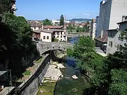 Mit einem gemauerten Bogen überbrückt sie die Schlucht der Orbe unterhalb der Altstadt, die auf einer Anhöhe nördlich des Flusses liegt.