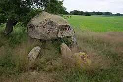 Die etwa 2,4 m lange Anlage war früher von einem Erdhügel überdeckt. Heute liegen die Steine frei. Der Innenraum misst 2,2 × 1,0 m und wird aus zwei Trägersteinen an den Schmalseiten und einen Trägerstein am nördlichen Ende begrenzt. Nach Süden ist der Dolmen offen. Auf dem Deckstein aus Granit, welcher den Namen Poppostein trägt, finden sich 17 eingeriebene, kleine Eintiefungen (dänisch skålformede fordybninger). Die Vorgeschichtsforscher nehmen an, dass sie in der Vorzeit in Verbindung mit kultischen Handlungen in den Stein getrieben wurden. Eine andere These ist, dass dem herausgeschlagenen Steinstaub besonderen Heilkraft zugeschrieben wurde, da die Schalensteine vorwiegend aus einer Granitsorte bestehen, die eine bestimmte chemische Zusammensetzung aufweisen. Die chemischen Elemente, die in den Schalensteinen in natürlichen, unterschiedlichen Verbindungen vorkommen, sind nach Aussage von Jakob Röschmann in der Heilkunde von großer Bedeutung.[1]