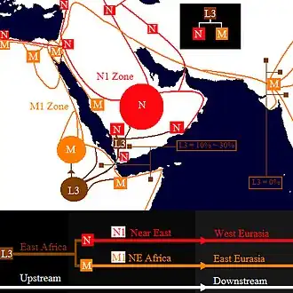 Verbreitung der mitochondrialen Haplogruppen N1 und M1 in Ostafrika, auf der arabischen Halbinsel und dem Nahem Osten