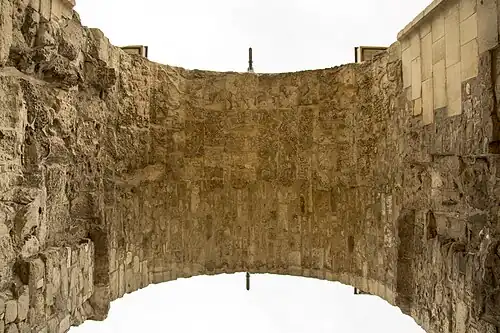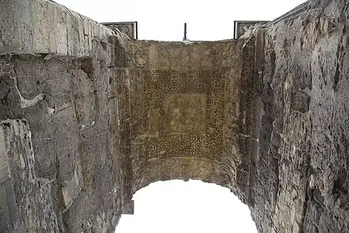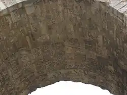 Auf der Außenseite der Bogenpfeiler sind korinthische Kapitelle angebracht, die unterhalb der Archivolte enden. In der Fläche über der Archivolte sind verschiedene Opferszenen dargestellt.