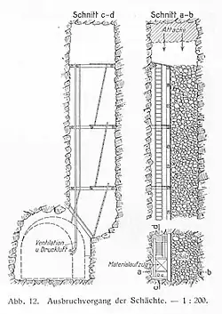 Die zwei senkrechten Schächte (später kam ein dritter dazu), die ausgebrochen wurden, standen im Kalkmergel und wurden nicht verkleidet. Der Kaminquerschnitt wurde in zwei Teile geteilt: der eine diente als Aufgang und Aufzug sowie zur Unterbringung der Ventilations- und Druckluftleitungen, während der andere als Silo benützt wurde. Der Siloteil war stets gefüllt: das unten im Stollen abgezogene Material wurde oben aus dem Ausbruch nachgefüllt. Der Abtransport des Rohmaterials aus dem Stollen erfolgte durch die Seilbahn automatisch. Die ganze Bedienung bestand in je einem Mann pro Kamin bei der Abfüllvorrichtung. Die gesamte Anlage mit Stollen, Rolllöcher und Voreinschnitt wurden innerhalb eines Jahres von der Hoch- und Tiefbau AG Aarau-Zürich erstellt.[2]