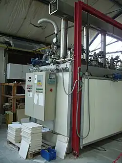 Die weitere Entwicklung in der Porzellanherstellung ist vor allem geprägt durch die zunehmende Industrialisierung und Änderung der Gebrauchsgewohnheiten. Die Einführung von Tunnelbrandöfen – erstmals 1905 bei Carl Tielsch – und Maschinen zur Fertigung einfacher Teile rationalisierten den Produktionsprozess und machten Porzellan zum Massenprodukt. Mit 28 Brennöfen war das Porzellanwerk Carl Tielsch im niederschlesischen Altwasser zeitweise das größte Porzellanwerk Deutschlands.[9] Aufgrund der schwierigen Herstellung komplexer Formen (Kannen, Henkeltassen) und der teilweise aufwändigen Dekorierung ist die Herstellung aber bis heute nicht vollständig automatisierbar. Zudem gab und gibt es bis heute Konkurrenz durch Produkte aus anderen Materialien wie Glas, Metall und Kunststoff.