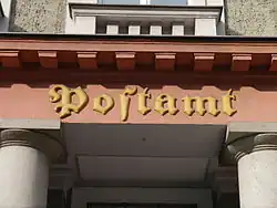 Portal des Baus mit dem Schriftzug „Postamt“ in Frakturschrift