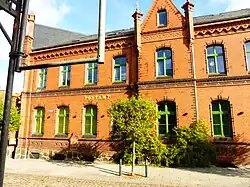 Das zweigeschossige verklinkerte historisierende Gebäude aus der Gründerzeit mit einem Satteldach über einem stark verzierten Gesims, den prägenden Giebelrisaliten an der Ecke mit dem Portal und der Hauptseite, den eckbetonenden Fialen, einem hohen Sockelgeschoss sowie den Segmentbögen über Fenstern und Tür wurde am 1. April 1887 als Kaiserliches Postamt eröffnet. Zeitgleich wurde das Telegraphenamt integriert. Über dem Eingang befand sich das Kaiserliche Wappen und eine Uhr. 1900 wurde das Gebäude nach rechts um zwei Achsen erweitert.[3]