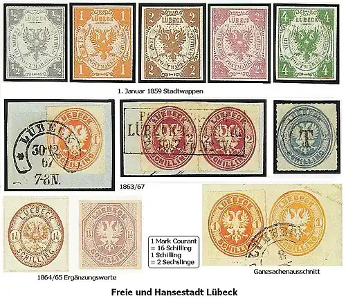 Briefmarken wurden am 1. Januar 1859 eingeführt. Sie zeigen einen doppelköpfigen Adler mit ausgebreiteten Flügeln. Auf einem, den Adler umschließenden Bande, liest man „Postmarke“ und die Angabe des Wertes in Buchstaben. An der oberen Seite steht das Wort „Lübeck“, und in den vier Ecken eine den Wert der Marke bezeichnende Zahl. Die Marken von 1863 zeigen denselben Adler in Oval in relief, oben das Wort „Luebeck“ auf den Seiten die Wertangabe und unten “Schilling”. Die Ganzsachenumschläge waren in Ausstattung und Preis den Briefmarken gleich.