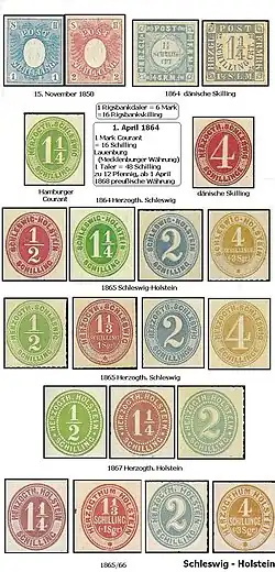 Als die Herzogtümer noch dänisch waren, waren auch die dänischen Briefmarken gebräuchlich. Am 1. Mai 1851 gelangten dänische Marken in Schleswig, am 1. Juli 1853 in Holstein und Lauenburg zur Einführung. Die ersten eigenen Marken in Holstein erschienen am 14. November 1850, sie waren ohne Länderbezeichnung, wurde in dänischen Skilling berechnet und wurden nur von holsteinischen Postämtern abgegeben. Dann wurden am 1. März 1864 je eine Landpostmarke nach dänischem Vorbild herausgegeben, in beiden Währungen. Am 10. März 1864 folgte Marken in Form des hohen Ovals, mit Angabe des Wertes in der Mitte, der Name „HERZOGTH, SCHLESWIG“ steht oben, unten „SCHILLINGE“, in dänischer Währung. Schon wenige Tage später, am 5. April 1864, erschien ein anderer Wert, nun in Hamburger Courant, bei dem unten „SCHILLING“ steht. Die nun folgenden Ausgaben unterscheiden sich hinsichtlich der Landesbezeichnung „HERZOGTH.HOLSTEIN“ bzw. „HERZOGTH.SCHLESWIG“, der Wertangabe und der Farbe.