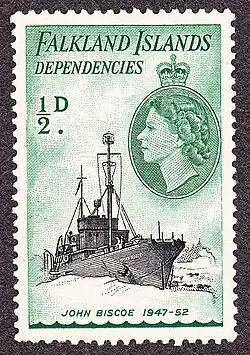 Das international nicht anerkannte Britische Antarktisterritorium wurde 1962 geschaffen, um die vom Antarktisvertrag betroffenen Gebiete administrativ von den Falklandinseln zu trennen. Die erste Briefmarkenserie von 1963 bestand aus 15 Werten, die Schiffe und ein Porträt von Königin Elisabeth II. zeigen. Die Marken wurden in britischer Währung ausgezeichnet, daher erfolgte 1971 wie in Großbritannien die Dezimalisierung, was einige Marken mit provisorischem neuen Wertaufdruck erforderlich machte. Briefmarken des Britischen Antarktisterritoriums werden von den Besatzungen und Besuchern der Forschungsstationen Faraday (bis 1996), Fossil Bluff, Halley, Port Lockroy, Rothera, Signy (bis 1996) und Sky Blu benutzt. Alle Stationen verwenden die gleiche Postleitzahl nach britischem Muster BIQQ 1ZZ.[7] Die Postbeförderung erfolgt in der Regel per Schiff bis Port Stanley auf den Falklandinseln, wo der Leiter des Postdienstes („The Antarctic Postman“) stationiert ist[8] und von dort per Flugzeug nach Großbritannien. Der Verkauf von Briefmarken deckt, neben den Einnahmen aus der Einkommensteuer der Stationbesatzungen, die Verwaltungskosten für das Territorium.[9]