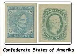 Die erste Marken der CSA erschienen 1861/62 mit dem Bild von Jefferson Davis, und Thomas Jefferson, in Varianten und Farbvariationen. Erstmals war eine lebende Person auf einer amerikanischen Marke zu sehen. Insgesamt wurden 11 Marken zu 2, 5 oder 10 Cent, mit abweichenden Farben, verausgabt. Ortsbriefe und Drucksachen kosteten 2 Cent, Briefe bis 500 Meilen je ½ Unze, 5, ab 1. Juli 1862 10 Cent, Briefe über 500 Meilen je ½ Unze 10 ab 1. Juli 1862 20 Cent.