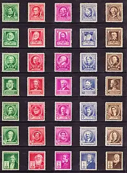 Das US-amerikanische Postamt gab ein Set von 35 Briefmarken die in 7 Gruppen zu je 5 Briefmarken herausgegeben und in 70er-Bogen gedruckt wurden.[5] Die Herausgabe erfolgte über einen Zeitraum von etwa zehn Monaten. Die 7 Gruppen sollen an Amerikas berühmte Autoren, Dichter, Pädagogen, Wissenschaftler, Komponisten, Künstler und Erfinder erinnern. Zu den Pädagogen gehörte Booker T. Washington, der als erster Afroamerikaner auf einer US-amerikanischen Marke ausgezeichnet wurde. Diese Serie von Postage-Ausgaben wurde vom Büro für Gravur und Druck (Bureau of Engraving and Printing) gedruckt. Diese Briefmarken waren größer als normale, endgültige Ausgaben, mit nur 280 Markenbildern auf der Druckplatte (400 Bilder waren Standard für die Presidential-Serie). Bemerkenswert ist auch die rot-violette Farbe, die für die 3 ¢ -Stempel gewählt wurde, ein hellerer Farbton als das traditionelle Lila. Die Briefmarken sind nach ihrem Wert gefärbt: 1 Cent grün, 2 Cent rot, 3 Cent violett, 5 Cent blau und 10 Cent braun. Der Rahmen des Stempels variiert von Gruppe zu Gruppe.