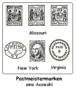 Für St. Louis (Missouri) gab es Werte zu 5, 10 und 30 Cent. Die Marken von New York gab es mit unterschiedlichen Initialen „A.C.M“, „R.H.M“ oder „H.M.Jr“. Der Zweiellipsenstempel „Lockport“ ist nur einmal auf Brief bekannt.[2]