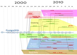 | 9.1 | 12. September 2011 | Version 9.1 brachte eine Verbesserung der Hochverfügbarkeit bei Betrieb von mehreren Servern mit Hilfe synchroner Replikation, Zugriff auf fremde Datenquellen, spaltenweise linguistisch korrekte Sortierbarkeit, Einbindung von Erweiterungen sowie eine Reihe weiterer Verbesserungen.[19] |