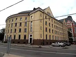 Die Krümmung der Hauptfassade wird durch zehn breite Pilaster über alle Geschosse gegliedert. Die beiden Eckfronten mit Treppenhäusern werden durch ein stark profiliertes 2-geschossiges Fenster akzentuiert. Ein einfaches, aber kraftvolles Gesims vervollständigt die Fassade. Das nächste steile Dach wurde nun durch ein flacheres ersetzt. Im Allgemeinen ist der ehemalige Zustand gut erhalten.