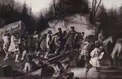 Auf drei kleinen Booten fuhren sie, so weit es ging, den Fluss hinauf. Oft mussten sie dabei die Boote über Land schleppen, bis sie schließlich den Wyg-See erreichten, der damals freilich noch nicht gestaut war. Weiter ging es auf dem Fluss Telekinka (Телекинка) und dem See Telekino (Телекино) – beide sind beim Aufstauen des Wyg-Sees verschwunden – bis zum heutigen Powenez, das sich in jener Zeit im Besitz des Wjaschischtschski-Klosters (Вяжищский монастырь) in Nowgorod befand.[4]