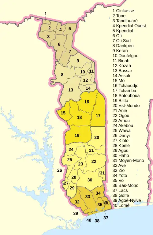 - ↑ Quatre nouvelles préfectures au Togo. Ministère de l'administration territoriale, de la décentralisation et des collectivités locales, abgerufen am 30. April 2020 (französisch).
