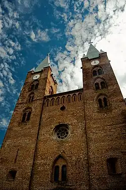 Es handelt sich um eine dreischiffige spätromanische Basilika, die später frühgotisch umgeformt wurde. Der Grundriss der Basilika blieb bis heute unverändert. Wie in der damaligen Zeit üblich, wurde sie in Ost-West-Richtung ausgerichtet, mit zwei Türmen und dem Haupteingang im Westen und kleiner Apsis im Osten. An den Türmen und der Fensterrose sind deutlich gotische Einflüsse sichtbar.