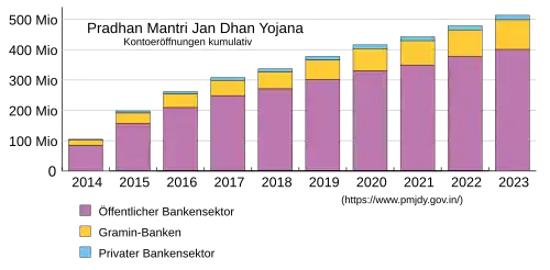 - ↑ Tripsha Ghosh: PM Jan Dhan Yojana Completes 9 Years Of Implementation; Here Are Some Interesting Facts. In: NDTV. 28. August 2023, abgerufen am 18. Mai 2024 (englisch).