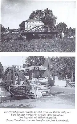 Am 30. August 1892 wurde die Praunheimer Brücke durch eine 17,5 Tonnen schwere Dampfwalze zum Einsturz gebracht.[3] Im Jahre 1969 wurde die Bogenbrücke überholt, war jedoch schon zum damaligen Zeitpunkt nicht mehr dem Verkehr gewachsen. Etwa 1985 wurde eine separate Fußgängerbrücke neben der Brücke errichtet. Mit dem Neubau der heutigen Brücke im Jahre 1988 wurde die demontierbare Fußgängerbrücke nach Hausen (Hausener Obergasse / Hausener Weg) verlegt.