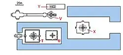Nur wenige Meter östlich von Tempel T liegt auf derselben Achse wie dieser Tempel U. Er ist von einer Sandsteinmauer umgeben, die auf einer geformten Basis steht. Tempel U hat eine Fläche von 35 × 28 m.[4] Den Eingang bildet kein Gopuram, sondern eine einfache Tür. Der nur teilweise erhaltene Prasat ist ähnlich aufgebaut wie bei Tempel T, aber von geringerer Größe. Die Außenwände der Vestibüle sind mit tanzenden Devas und Apsaras vor einem floralen Hintergrund verziert.[6] Neben den Eingängen sind an ihrer Stelle Dvarapalas abgebildet. An der Basis der Pilaster befinden sich Blendbögen, die kleine Szenen mit Figuren aufweisen. Dies ist ein typisches Stilmittel der Zeit von Angkor Wat.[7] Die verzierten Giebelfelder über den Eingangsportalen der Cella zeigen im Norden das Quirlen des Milchozeans und im Westen die Trimurti, also die drei großen hinduistischen Götter Brahma, Vishnu und Shiva. In dieser Darstellung tanzt Shiva als mehrarmiger Nataraja zwischen Brahma und Vishnu und steht dabei auf dem Kopf des alles verschlingenden Dämons Kala, welcher in der indischen Ikonografie als Kirtimukha bekannt ist und zur Abschreckung böser Geister dient.[8] Im Süden zeigt das – gleich den Säulen der Eingangsportale – unvollendet gebliebene Relief des Giebelfelds Vishnu und Shiva ein weiteres Mal auf Kala reitend. Türstürze dieser Art, in deren Mitte ein solcher Dämonenkopf abgebildet ist, sind seit dem Preah-Ko-Stil zur Zeit Indravarmans I. (877–890), unter dem sie kunsthandwerklich zur Blüte gelangten, ein typisches Element der Baukunst der Khmer.[9] Das Kala-Motiv geht auf Einflüsse der Champa und aus Java zurück und fand bereits in der Gründungszeit Angkors unter Jayavarman II. im Kulen-Stil erste Verwendung.[10] Die Cella ist 2 × 2 m groß.