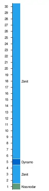 | 1. | Zenit St. Petersburg (M) | 30 | 19 | 8 | 3 | 66:28 | +38 | 65 |