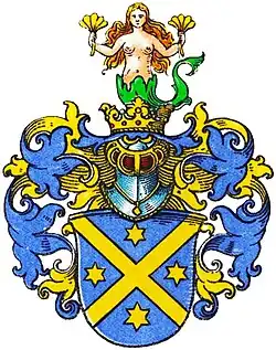 Blasonierung: In Blau ein goldenes Andreaskreuz, in jedem Winkel ein goldener Stern. Auf dem gekrönten Helm mit blau-goldenen Helmdecken eine Seejungfer mit grünem Fischschwanz, die die beiden Arme aufgehoben hat und in jeder Hand einen goldenen Federwedel (zuweilen auch einen Spiegel) hält.[1]