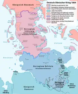 Der erste dieser Konflikte war der Deutsch-Dänische Krieg von 1864. Er wurde ausgelöst durch die Verabschiedung der dänischen Novemberverfassung von 1863. Mit ihr versuchte die Regierung in Kopenhagen, das Herzogtum Schleswig vom Herzogtum Holstein zu trennen und mit dem Königreich Dänemark zu verbinden. Das aber widersprach den Bestimmungen des Londoner Protokolls von 1852, das lediglich eine Personalunion zwischen den beiden vereinten Herzogtümern und dem Königreich vorsah. Der Deutsche Bund, zu dem Holstein gehörte, erklärte Dänemark den Krieg. Nach dem Sieg der Bundestruppen unter der gemeinsamen Führung Preußens und Österreichs musste die dänische Krone im Frieden von Wien auf die Herzogtümer Schleswig, Holstein und Lauenburg verzichten. Diese wurden von Preußen und Österreich zunächst gemeinsam verwaltet.