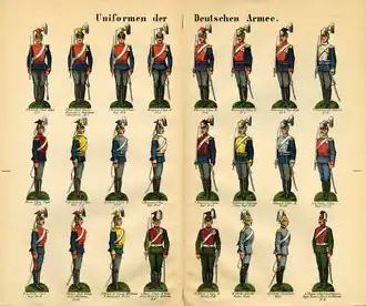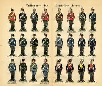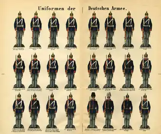 Mit der Gründung des Deutschen Kaiserreiches im Jahr 1871 wurde die preußische Armee zum Kernbestandteil des Deutschen Heeres, die Badische Armee ging als XIV. Korps in ihr auf. Auch die Armee des Großherzogtums Hessen wurde mit Militärkonvention vom 13. Juni 1871 zum 1. Januar 1872 als Großherzoglich Hessische (25.) Division eingegliedert.[8] Die preußische Armee blieb in Friedenszeiten rechtlich neben den anderen Länderarmeen (Sächsische Armee, Bayerische Armee, Württembergische Armee) bestehen.