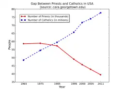 In den Vereinigten Staaten ging die Zahl der Priester in den Jahren 1970 bis 2023 von 59.192 auf 33.589 zurück.[49] 3.471 von 16.267 Pfarreien waren 2019 ohne eigenen Priester.[49] Die Zahl der Katholiken pro Priester stieg von 827 im Jahr 1965 auf circa 2000 im Jahr 2023.[49]
