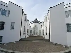 Der innere Bereich des Priesterseminars ist in einem schlichten Weiß ausgestaltet. Viele Fenster durchfluten das Gebäude mit Tageslicht.