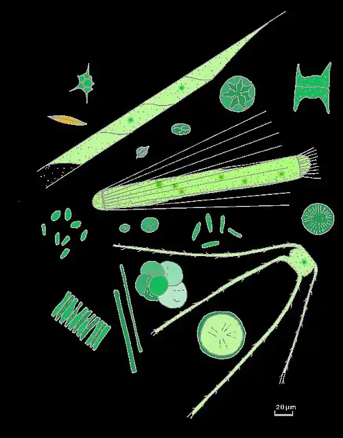 In stehenden Gewässern nehmen die Rolle der Primärproduzenten bevorzugt die Algen des Planktons ein. Hierzu zählen auch photosynthetisch aktive Prokaryonten, insbesondere Cyanobakterien (alias Blaugrünbakterien, früher Blaualgen genannt); an besonderen Biotopen kommen als Primärproduzenten aber auch andere, zu einer primitiveren Form der Photosynthese fähige Bakterien oder Archaeen vor.