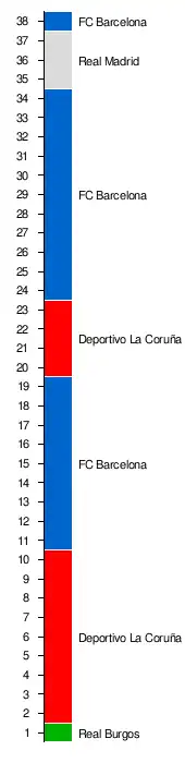 Titelverteidiger FC Barcelona wurde zum 13. Mal spanischer Meister. Wie im Vorjahr musste Real Madrid am letzten Spieltag den Rivalen aus Katalonien vorbeiziehen lassen. Und wieder war es CD Teneriffa, der Real Madrid am letzten Spieltag den Titel verdarb.