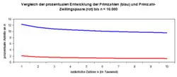 Sowohl die prozentualen Anteile der Primzahlen als auch – auf niedrigerem Niveau – die der Primzahl-Zwillingspaare an den natürlichen Zahlen n fallen bis zur Berechnungsgrenze n = 100.000 streng monoton, aber relativ langsam (siehe Grafik rechts). Somit deutet nichts darauf hin, dass die Primzahl-Zwillingspaare sich hinsichtlich der Unendlichkeitsvermutung signifikant anders entwickeln als die Primzahlen, deren Anzahl ja bewiesenermaßen unendlich ist. Zwar sprechen demnach die beiden Entwicklungen eher für die Existenz unendlich vieler Primzahl-Zwillingspaare als dagegen, beweisen diese jedoch nicht.[2]