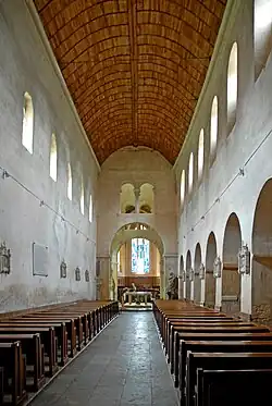 Die Kirche besaß bis in das 16. Jahrhundert ein dreischiffiges Langhaus mit basilikalem Aufriss. Das Mittelschiff ragte über die beiden mit Pultdächern gedeckten Seitenschiffe beträchtlich hinaus, so dass in der Obergadenzone Fenster ausgespart werden konnten, die das Mittelschiff direkt belichten. Heute existiert davon nur das wieder errichtete Mittelschiff und das südöstliche Seitenschiff, die Ansicht des Langhauses von Südwesten entspricht noch weitgehend dem ursprünglichen Zustand. Auf der Nordostseite fehlt das ehemalige Seitenschiff. Die sehr schlichte Nordostwand des Hauptschiffs weist im oberen Bereich nur sechs kleine spitzbogige Fenster mit einfachem gotischen Maßwerk auf, die gegenüber den sechs rundbogigen Obergadenfenstern der Südostwand angeordnet sind, und einen einzigen rechtwinkligen Strebepfeiler, der gerade bis in zwei Drittel der Wandhöhe hinaufreicht. Dass das Langhaus zwischen 1120 und 1130 um ein größeres Joch nach Westen erweitert worden ist, kann man von außen kaum erkennen. Es fehlen dort nur die Obergadenfenster.