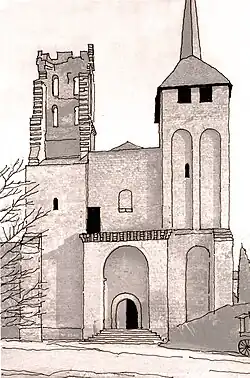 Am westlichen Ende des Langhauses wird das Schiff von zwei im Grundriss fast quadratischen Glockentürmen auf etwa die Hälfte eingeengt. Sie bilden zusammen mit dem Mittelteil ein mächtiges Westwerk, etwas breiter als das Langhaus. Der Südturm ist mit einem flach geneigten Pyramidendach abgedeckt, mit dem es den Langhausfirst kaum überragt. Knapp unter seinen Traufen sind auf jeder Seite zwei rundbogige Schallluken ausgespart. Der Nordturm ist einmal beträchtlich erhöht worden. Auf jeder Seite der Erhöhung befanden sich vier rundbogige Schallluken. Die Aufstockung ist auf der Westseite gut zur Hälfte eingestürzt. Die Turmseiten werden oberhalb des Erdgeschosses durch je zwei vertikal lang gestreckte Arkadennischen gegliedert.