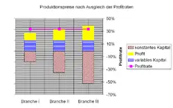 Wären die Preise gleich den Werten, dann wären auch die Profite gleich den Mehrwerten und in der Branche I würde die größte Profitrate (Verhältnis Mehrwert zum eingesetzten Kapital, das sich aus variablem und konstantem Kapital zusammensetzt), in der Branche III die niedrigste Profitrate anfallen.