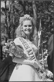 Erste Produktköniginnen wurden in den Vereinigten Staaten gekürt. Dort werden landwirtschaftliche Erzeuger seit Beginn des 20. Jahrhunderts von ihnen vertreten.[9] Am populärsten sind hier die Repräsentantinnen der Milchindustrie (Dairy Princesses).[9] Daneben gibt es in vielen Regionen Apple-, Farm-, Peanut-, Potatoe-, Pumpkin-, Tobacco- oder Turkey-Queens. Andere Hoheiten sind mit regionalen Veranstaltungen verbunden. So gibt es seit 1933 eine Rosenkönigin (Rose Queen) anlässlich des Tyler Rose Festivals in Tyler (Texas).[10] Besonders bei den Wahlen zu den US-amerikanischen Festivalköniginnen ist der Übergang zwischen Produkt- und Schönheitskönigin fließend. Eine Besonderheit ist der 1968 in Kalifornien initiierte Cherry Blossom Court. Die jeweils rund fünf Kirschblütenhoheiten, die zum jährlichen Cherry Blossom Festivals gewählt werden, vertreten US-Amerikaner japanischer Herkunft und sollen der Festigung des japanisch-amerikanischen Verhältnisses dienen.[11] In den 1950er und 1960er Jahren wurden – ebenfalls in Kalifornien – Weinköniginnen gekürt.[12] Bereits seit 1931 werden in Deutschland Weinköniginnen und seit 1985 auch Milchköniginnen (Bayerische Milchkönigin) gewählt. Eine größere Bedeutung haben im süddeutschen Raum auch Königinnen im Umfeld der Bierherstellung (z. B. die Bayerische Bierkönigin, die Württembergische Bierkönigin, die Rettenberger Bierkönigin oder die Hallertauer und Haunstetter Hopfenköniginnen).