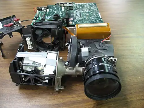 Die Entstehungsgeschichte der verschiedenen Projektionsanzeigen ist in einer englischsprachigen Dokumentation von Texas Instruments (TI) zusammengestellt worden, unter besonderer Berücksichtigung der TI-Erfindung des Digital Light Processing (DLP) mittels des Digital Micromirror Device (DMD). Anfänglich wurden mit der ursprünglichen Technik ab etwa 1980 Drucker und andere Applikationen entwickelt. Ab 1989 startete ein Programm zur Entwicklung entsprechender Projektoren. Der erste kommerziell erhältliche DLP-Projektor von TI wurde im April 1996 vorgestellt.[18] Die Fertigung von DLP-Projektoren in Deutschland wurde von Liesegang mit dem Projektor „ddv 800“ 1997 begonnen.[19][20]