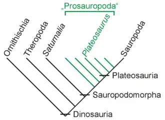 Mit zunehmender Anwendung kladistischer Methoden in der Dinosaurologie ergaben sich vermehrt Hinweise darauf, dass die „Prosauropoda“ keine natürliche (geschlossene) Verwandtschaftsgruppe (Monophylum) bilden, sondern dass sie eine Reihe von Gruppen auf der Stammlinie der Sauropoda umfassen (Paraphylum).[2] Somit sollte die Bezeichnung „Prosauropoda“ stets in Anführungszeichen gesetzt werden.