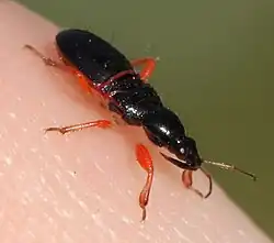 Die Wanzen werden 7,5 bis 10,0 Millimeter lang.[1] Der Halsschild ist schwarz gefärbt und trägt häufig einen blauen bis grünlichen metallischen Schimmer. Die Hemielytren und die Beine sind rot. Die Schenkel (Femora) der vorderen Beine sind kurz und dick. Die Stinkdrüsen liegen am Rücken des Hinterleibs. Es treten sowohl lang-, als auch kurzflügelige Individuen auf.[2]