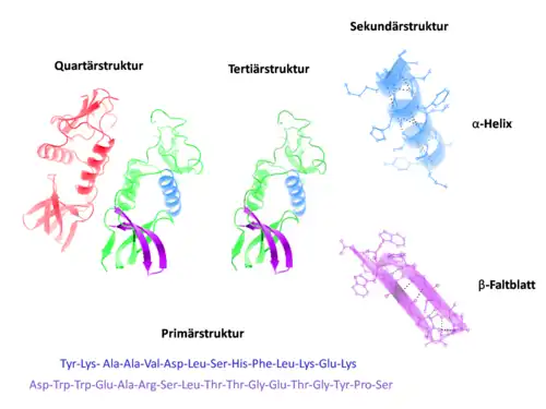 Proteine werden an den Ribosomen als lineare Polypeptidketten aus Aminosäuren synthetisiert. Die Abfolge der einzelnen Aminosäuren bildet die Primärstruktur des Proteins. Während oder nach der Synthese faltet sich die Polypeptidkette in eine definierte räumliche Struktur (Tertiärstruktur), die aus kleineren Strukturelementen (Sekundärstruktur) aufgebaut ist. Einige Proteine bestehen aus mehr als einer Polypeptidkette. Bildet sich ein solcher Oligomer aus mehreren Polypeptidketten in Tertiärstruktur, so spricht man von einer Quartärstruktur. Die Primärstruktur besteht aus kovalent über Peptidbindungen verbundenen Aminosäuren. Die Proteinfaltung ergibt sich aus den weiterhin wirkenden Bindungen und Kräften (ionische, polare und Van-der-Waals-Wechselwirkungen, Wasserstoffbrückenbindungen, hydrophobe Effekte) zwischen verschiedenen Atomen, in Einzelfällen wird die Sekundär-, Tertiär- und Quartärstruktur nach der Translation durch kovalente Bindungen wie Disulfidbrücken und Isopeptidbindungen stabilisiert.