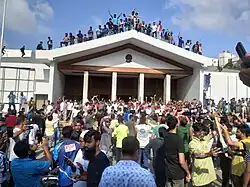 Am 5. August trat Sheikh Hasina im Zuge der neuen Protestwelle zurück und verließ das Land in einem Hubschrauber nach Indien. Demonstranten stürmten ihren Amtssitz, nachdem sie diesen bereits verlassen hatte. Auch das Parlamentsgebäude sowie Häuser und Geschäfte von Mitgliedern der Awami-Liga wurden gestürmt.[20] Bei der Inbrandsetzung eines Hotels eines führenden Mitglieds von Hasinas Partei in der Stadt Jessore sollen mehr als ein Dutzend Menschen ums Leben gekommen sein. Mindestens 35 weitere Menschen wurden bei Gewaltausschreitungen in Sabhar außerhalb von Dhaka und in der Vorstadt Uttara getötet. Im Distrikt Satkhira im Südwesten von Bangladesch entkamen fast 600 Gefangene und Häftlinge bei einem Angriff auf ein Gefängnis.[17] Auch Hindus, die etwa 8 Prozent der vorwiegend muslimischen Bevölkerung ausmachen und traditionell oft Anhänger der säkularen Awami-Liga sind, wurden Ziel von Angriffen.[21] In indischen sozialen Medien wurden Bilder von Lynchmorden und Inbrandsetzungen von Hindutempeln verbreitet. Um weitere Stätten und Bevölkerungsgruppen vor Angriffen zu schützen, bildeten sich Freiwilligengruppen der studentischen Protestbewegung.[21]