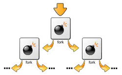 Das folgende Programmbeispiel erzeugt eine Forkbomb. Es wird ein Prozess gestartet, der in einer Endlosschleife mittels fork() immer wieder Kindprozesse erzeugt, die sich gleich verhalten wie der Elternprozess. Dadurch werden die verfügbaren Systemressourcen (Prozesstabellen, CPU usw.) aufgebraucht. Eine Forkbomb realisiert somit eine Denial-of-Service-Attacke, kann aber auch bei unbedachter Anwendung des fork-Aufrufs „hochgehen“.