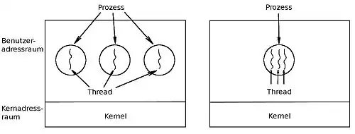 Die Implementierung von Threads hängt vom jeweiligen Betriebssystem ab. Sie kann auf Kernel- oder auf Benutzerebene erfolgen. So sind Threads in Windows-Betriebssystemen auf Kernelebene realisiert, in Unix sind Thread-Implementierungen sowohl auf der Kernel- als auch auf der Benutzerebene möglich. Bei Threads auf der Benutzerebene führt die entsprechende Threadbibliothek das Scheduling und Umschalten zwischen den Threads durch. Jeder Prozess verwaltet einen privaten Thread-Kontrollblock (analog zum PCB) und der Kern hat keinerlei Kenntnis davon, ob ein Prozess mehrere Threads verwendet oder nicht. Bei Kernel-Threads werden die Threads im Kernelmodus verwaltet. Eine spezielle Threadbibliothek ist dabei für den Anwendungsprogrammierer nicht erforderlich. Der Kern ist hier also an der Erzeugung und Umschaltung von Threads beteiligt.[38]