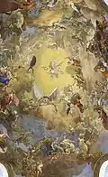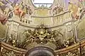In den Deckenfresken des Prunksaals spiegelt sich u. a. wider, dass die Bücher thematisch aufgeteilt wurden nach dem Kriterium, ob sie dem Themenkreis des Kriegs (Bereich am Eingang, nahe dem Augustinerlesesaal) oder jenem des Friedens (Bereich an den Redoutensälen) zuzuordnen sind.[5] Die Fresken stammen von Daniel Gran und wurden von 1726 bis 1730 gemalt. Das Fresko in der Mittelkuppel stellt die Apotheose Karls VI. dar, dessen Bild von Herkules und Apoll gehalten wird.[5] Um das Bild des Kaisers sind in einem komplizierten Programm allerlei allegorische Figuren versammelt, die die Tugenden der Habsburger und den Reichtum ihrer Länder symbolisieren sollen. Das Herrschaftsprogramm schuf der Hofgelehrte Conrad Adolph von Albrecht.[5] Ferner zeigen die Fresken die allegorische Geschichte der Erbauung der Hofbibliothek. Das Deckenfresko von Gran wurde von Franz Anton Maulbertsch restauriert.