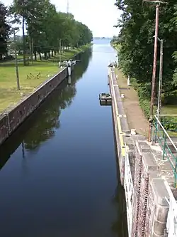 Die Entwicklung des Orts Einlage erfolgte, als mit dem Bau des Weichseldurchstichs begonnen wurde. Im Jahr 1895 wurde eine Schleuse gebaut, die den Wasserstand in der Toten Weichsel regulierte und als Hochwasserschutz diente. Neben der Schleuse für Schiffe gab es auch eine für Flöße. Zwischen den Schleusen befand sich eine Quarantäneanlage. Einlage erhielt einen Hafen für seine Fischer. An der Toten Weichsel gab es einen Anleger für Sportboote und einen Badebereich. Im Jahr 1905 wurde die Schmalspurbahn der Westpreußischen Kleinbahnen eröffnet. In der Landgemeinde bestanden die Haltestellen Schusterkrug, Einlage und Einlage Siedlung.[2]