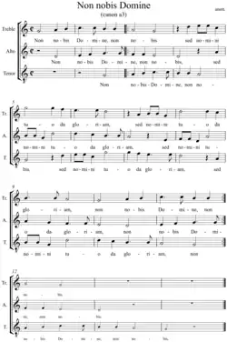 Vertonungen des Non nobis Domine sind überliefert von Richard Mudge, Jean Mouton, William Byrd sowie Felix Mendelssohn Bartholdy („Nicht unserm Namen, Herr“ op. 31 MWV A 9). Derzeit am meisten gespielt und gesungen wird die Vertonung von Patrick Doyle aus Sir Kenneth Branaghs filmischer Adaption von Shakespeares Heinrich V. (1989).