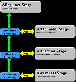 Die Abbildung zeigt die vier Ebenen des PCM – Awareness, Attraction, Attachment and Allegiance. Wobei die psychologische Bindung des Individuums mit jeder Ebene zunimmt. In jeder Ebene findet ein Entscheidungsprozess statt, bei dem Inputs (grüne Pfeile) die internen Prozesse (blaue Box) beeinflussen, welche wiederum Output (gelbe Pfeile) generieren. Die einzelnen Entscheidungsprozesse hängen von der Stärke der psychologischen Bindung des Konsumenten zu einem Sport/Team/Event ab.