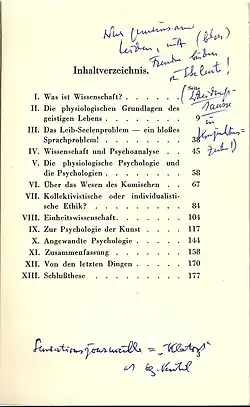 „Wer einmal von dieser Leidenschaft erfasst ist, ‘psychologisch’ den Dingen auf den Grund zu gehen, hinter die Fassaden des Alltagslebens zu sehen, der muss, wie bei einem spannenden Kriminalroman, weiterlesen. Wie wir in ‘Psychologie und Weltanschauung’ früher schon ausführten, ist aber Psychologie im Grunde mehr als das. Sie ist für den, der sich ein umfassendes Weltbild, eine verantwortungsbewusste ‘Weltanschauung’ aufbauen will, um seinem Lebensplan Sinn und Richtung zu geben, eine unerlässliche Grundlage.“[21]