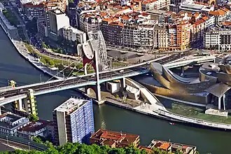 Das weitgehend mit Titanblech verkleidete Guggenheim-Museum Bilbao steht unmittelbar neben und auch unter ihr. Zwei teilweise mit dem gleichen Titanblech verkleidete Gerüsttürme neben der Brücke (Torre de La Salve) dienen als Treppenverbindung zwischen der Brücke und dem Museum. Das Werk Arcos rojos / Arku gorriak (Rote Bögen) von Daniel Buren verwandelte den ursprünglichen Pylon der Brücke in einen das Stadtbild prägenden Kontrast zu dem silbergrauen Titanblech des Museums.[2]
